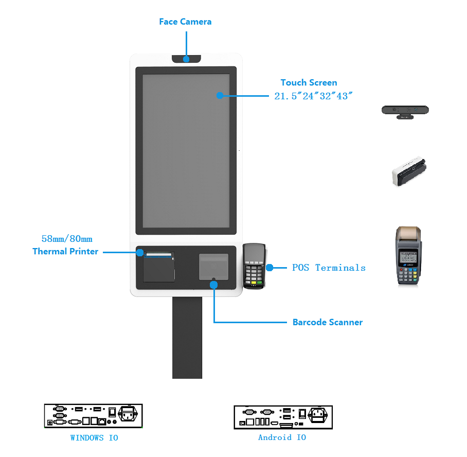Optional accessories: QR code scanner, card reader NFC, 58/80mm thermal printer
