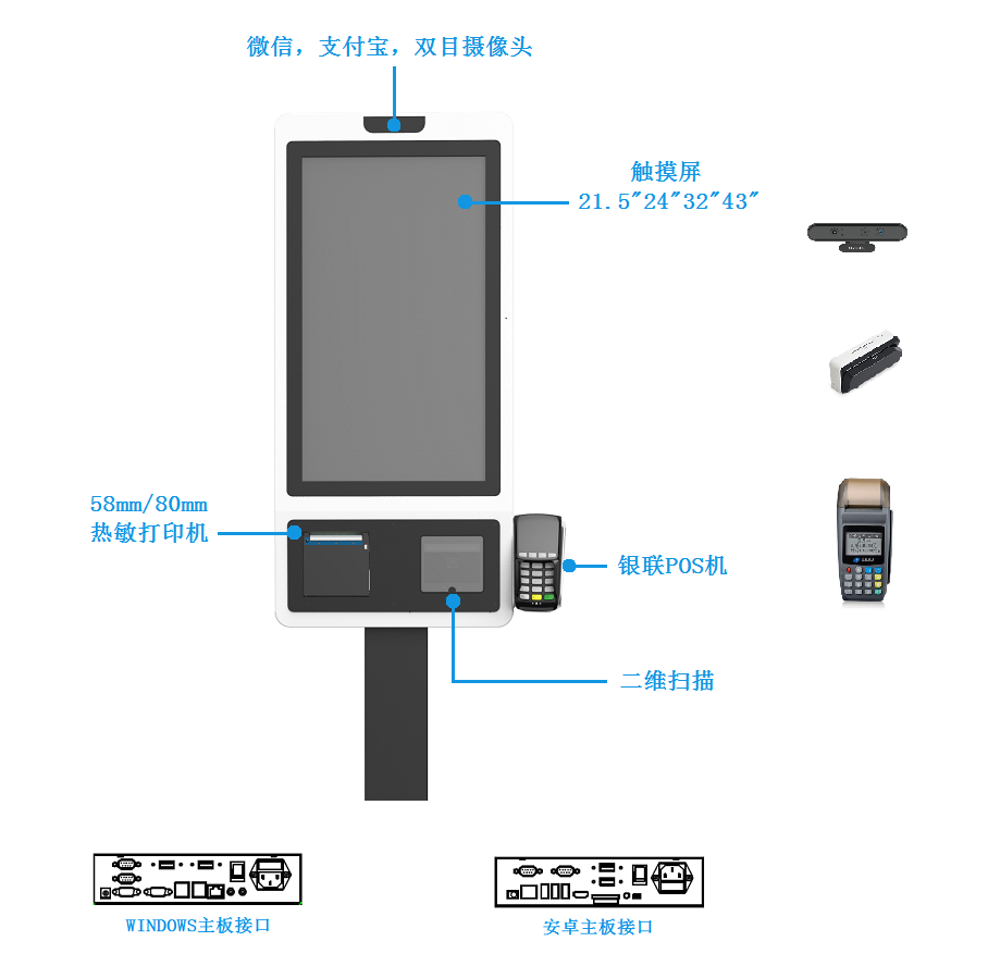 可選配件: 二維掃描器,NFC讀卡器,58/80mm熱敏打印機(jī),76mm發(fā)票打印機(jī)